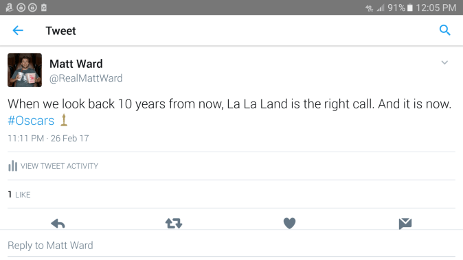 Today, less than 24 hours after the Oscars, I still can’t find any reasonable argument that “La La Land” wasn’t the best cinematic experience of 2016, the perfect blend of commercial success and critical darling that we as moviegoers deserved to see win the Academy’s top prize.